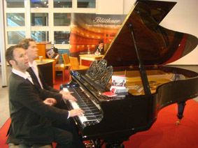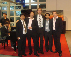 春天是萬物復(fù)蘇的季節(jié),廣州的4月更是早已遍地鮮花,一些樹 也長出了它“新的年輪”。在地球另一端的德國,一年一度的國際 法蘭克福樂器展正在如火如荼的舉行著,德國鋼琴制造業(yè)協(xié)會( BVK)主席、德國博蘭斯勒鋼琴總裁博思進(Dr.Christian Blüthner)博士、博蘭斯勒(中國)總經(jīng)理方陽先生、以及歐米 勒孖寶再次盛裝出席法蘭克福樂器展。歐米勒孖寶受邀在展會表演 區(qū)以他們獨具特色的演繹為09年這樣一個特殊環(huán)境下的展會帶來 了激動人心的活力與激情。