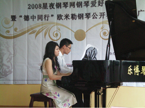 2008年9月20日下午14:00,由德國博蘭斯勒鋼琴(中國) 有限公司和星夜鋼琴網(wǎng)共同主辦、南京樂博琴行協(xié)辦的2008星夜 鋼琴網(wǎng)鋼琴愛好者交流會暨“德中同行”-歐米勒國際鋼琴公開賽 南京地區(qū)推廣活動在江蘇省南京市樂博琴行漢中路店三樓音樂廳隆 重舉行。出席本次推廣活動的嘉賓有:德國博蘭斯勒鋼琴(中國) 有限公司銷售部經(jīng)理詹八寶小姐、星夜鋼琴網(wǎng)總經(jīng)理曾繼桂先生、 旅法鋼琴家張韻小姐、著名鋼琴家法國巴黎國際鋼琴比賽第一名獲 得者馮頁先生、江蘇樂博樂器銷售有限公司總經(jīng)理胡俊先生及百多 位鋼琴愛好者。