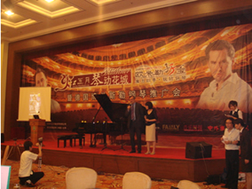5月22日“火紅五月 琴動(dòng)花城”博蘭斯勒廣州品鑒會(huì)在廣東迎 賓館宴會(huì)廳絢麗盛開(kāi)。倪紅閃爍,旋律蕩漾,伴著悠揚(yáng)的鋼琴曲, 一走進(jìn)會(huì)場(chǎng)就可以發(fā)現(xiàn)一直鋪到舞臺(tái)中央的紅地毯上八臺(tái)工藝制作 精美的博蘭斯勒(Blüthner)、海斯勒(Haessler) 、歐米勒 (Irmler)、塞勒(Schiller)品牌鋼琴悉數(shù)陳放,舞臺(tái)中央擺放的是 尊貴、大氣博蘭斯勒九尺三角鋼琴(MODEL1),整個(gè)大廳就象 是一個(gè)歐洲的宮廷,金碧輝煌的掉燈,美侖美奐的歐式風(fēng)格造型, 高雅的相筐墻裱畫(huà),又感覺(jué)是走進(jìn)了鋼琴博物館。