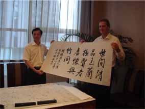 受深圳市政府的熱情邀請(qǐng),博蘭斯勒總裁博思進(jìn)博士與中國(guó)區(qū) 總經(jīng)理方陽(yáng)一行四人于7月18日再次到深圳市考察深圳投資環(huán)境, 在深圳市有關(guān)領(lǐng)導(dǎo)李平、夏楊及保稅區(qū)招商部何文斌部長(zhǎng)的陪同下 參觀了深圳市保稅區(qū),深圳市有關(guān)領(lǐng)導(dǎo)詳細(xì)介紹了保稅區(qū)的投資情 況,目前國(guó)際著名大公司均在深圳保稅區(qū)有投資,博思進(jìn)博士對(duì)深 圳保稅區(qū)投資表示了濃厚興趣,并與深圳市文產(chǎn)辦鐘蔭騰主任洽談 深圳有關(guān)投資事宜。洽談會(huì)后,深圳文產(chǎn)辦林主任還特意為博思進(jìn) 博士揮毫潑墨,以示中德合作友好。深圳市領(lǐng)導(dǎo)及博思進(jìn)博士及方 陽(yáng)總經(jīng)理一行以共進(jìn)晚宴,圓滿結(jié)束合作會(huì)談。