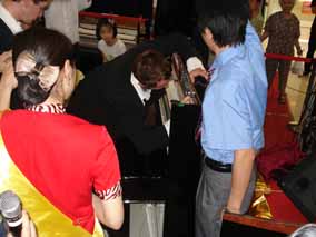 表演現(xiàn)場“歐米勒孖寶”還為購買“德國歐米勒”鋼琴的十幾 位買家設(shè)立了一個特殊簽售歐米勒鋼琴環(huán)節(jié),“歐米勒孖寶”雙雙 在每一臺歐米勒鋼琴上留下各自的簽名。精彩的演出令在場觀眾尤 為留戀,他們極力拍手、瘋狂呼喊“孖寶、孖寶”。當(dāng)“歐米勒孖 寶”重返舞臺時,用他們的拿手好戲——用網(wǎng)球彈奏鋼琴來回報現(xiàn) 場觀眾的厚愛,精彩絕倫的表演再次吸引了現(xiàn)場眾,他們紛紛涌到 臺前,瘋了!瘋了!!又瘋了?。?!