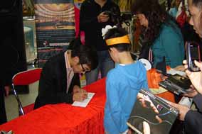 隨后,趙胤胤接受廣州媒體的采訪,他向媒體和觀眾介紹了他 新專輯的曲目、風(fēng)格,并現(xiàn)場接受媒體和聽眾的提問,趙胤胤幽默 機智地回答引來陣陣歡笑,之后又為觀眾獻上了一曲格什溫的《藍(lán) 色狂想曲》,這曲融爵士樂和交響樂風(fēng)格于一體的曲子將現(xiàn)場氣氛 帶到了高潮。最后,現(xiàn)場簽售專輯正式開始,樂迷們早以迫不及待 的排起了長長的隊伍,場面熱烈而有序。為了慶祝本次活動的圓滿 成功,博蘭斯勒鋼琴中國公司為趙胤胤送上鮮花以表祝賀。