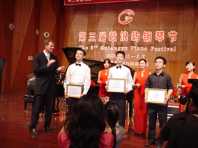 德國(guó)博蘭斯勒鋼琴公司總裁博思進(jìn)先生為全國(guó)青少年鋼琴比賽 專業(yè)青年組的前三名選手王天陽(yáng)、周韻清和沈璐頒發(fā)了證書(shū),這三 位選手獲得免除預(yù)選而直接參加第三屆魯賓斯坦國(guó)際鋼琴比賽的資 格。