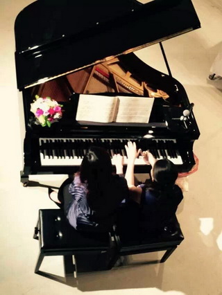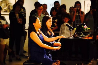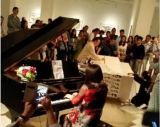 17日畫(huà)展現(xiàn)場(chǎng),主辦方同時(shí)邀請(qǐng)了上海音樂(lè)學(xué)院旅歐青年鋼琴家唐瑾,朱和,謝亞雙子,江瀅攜手德國(guó)國(guó)寶博蘭斯勒旗下歐米勒鋼琴共同演繹書(shū)法與鋼琴的對(duì)話。
