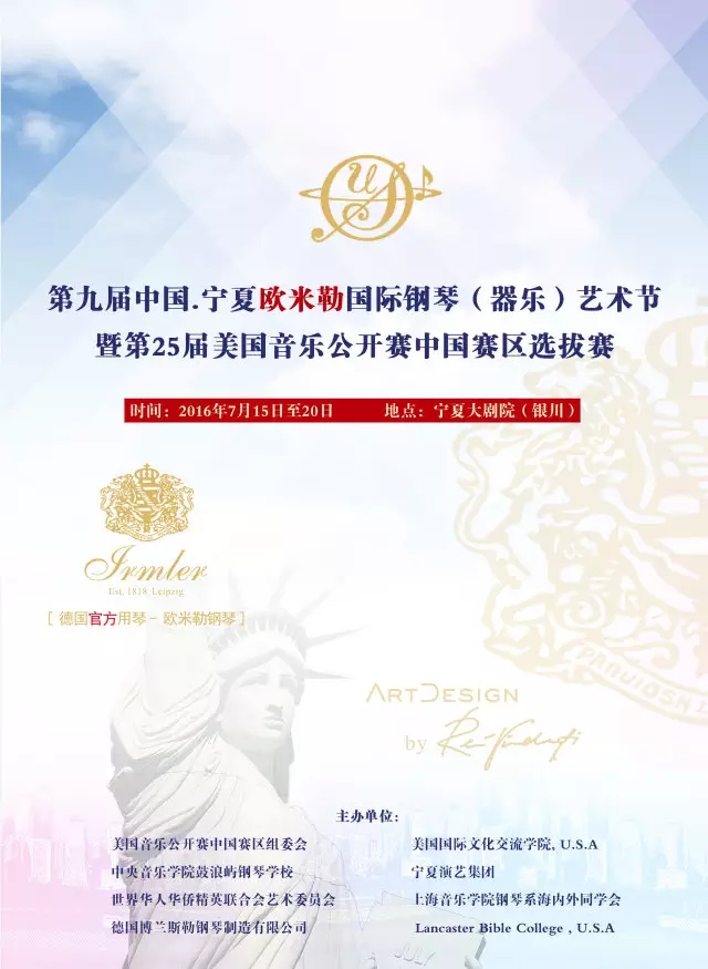 16日,由美國(guó)音樂(lè)公開(kāi)賽中國(guó)賽區(qū)組委會(huì)、中央音樂(lè)學(xué)院鼓浪嶼鋼琴學(xué)校、寧夏演藝集團(tuán) 、上海音樂(lè)學(xué)院鋼琴系海內(nèi)外同學(xué)會(huì)、世界華人華僑精英聯(lián)合會(huì)藝術(shù)委員會(huì)、德國(guó)博蘭斯勒鋼琴(中國(guó))有限公司聯(lián)合主辦的——第九屆中國(guó)·寧夏歐米勒國(guó)際鋼琴藝術(shù)節(jié)暨第25屆美國(guó)音樂(lè)公開(kāi)賽中國(guó)賽區(qū)選拔賽正式在著名的西夏古都、“塞上江南”美麗的寧夏銀川拉開(kāi)帷幕。