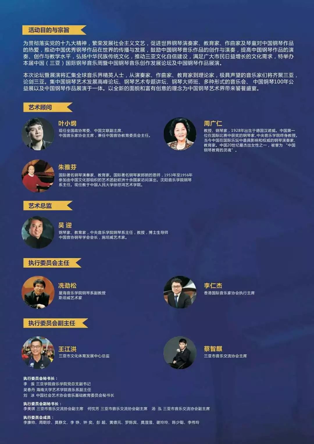 2018首屆中國(guó)(三亞)國(guó)際鋼琴音樂(lè)周,由現(xiàn)任全國(guó)政協(xié)常委、中國(guó)文聯(lián)副主席、中國(guó)音樂(lè)家協(xié)會(huì)主席,兼任中國(guó)音協(xié)教育委員會(huì)主任葉小綱;被譽(yù)為“中國(guó)鋼琴教育的靈魂”周廣仁與國(guó)際著名鋼琴演奏家、教育家朱雅芬擔(dān)任藝術(shù)顧問(wèn)。中央音樂(lè)學(xué)院鋼琴系主任、中國(guó)音協(xié)鋼琴學(xué)會(huì)會(huì)長(zhǎng),著名鋼琴家吳迎擔(dān)任藝術(shù)總監(jiān)。本屆音樂(lè)周總共匯集了得到了中國(guó)音協(xié)鋼琴學(xué)會(huì)、中國(guó)11大音樂(lè)學(xué)院等25個(gè)專業(yè)團(tuán)體支持,音樂(lè)周規(guī)??涨?,活動(dòng)形式豐富多彩,集高峰論壇、專題講座、大師公開(kāi)課、多種形式的音樂(lè)會(huì)以及中國(guó)鋼琴作品展演于一體,內(nèi)容豐富是目前全國(guó)兼具欣賞價(jià)值和學(xué)術(shù)高度的音樂(lè)活動(dòng)之一。德國(guó)博蘭斯勒鋼琴中國(guó)區(qū)總裁方陽(yáng),德國(guó)博蘭斯勒鋼琴海口專營(yíng)店總經(jīng)理黃德元,羅賓應(yīng)邀出席活動(dòng)。