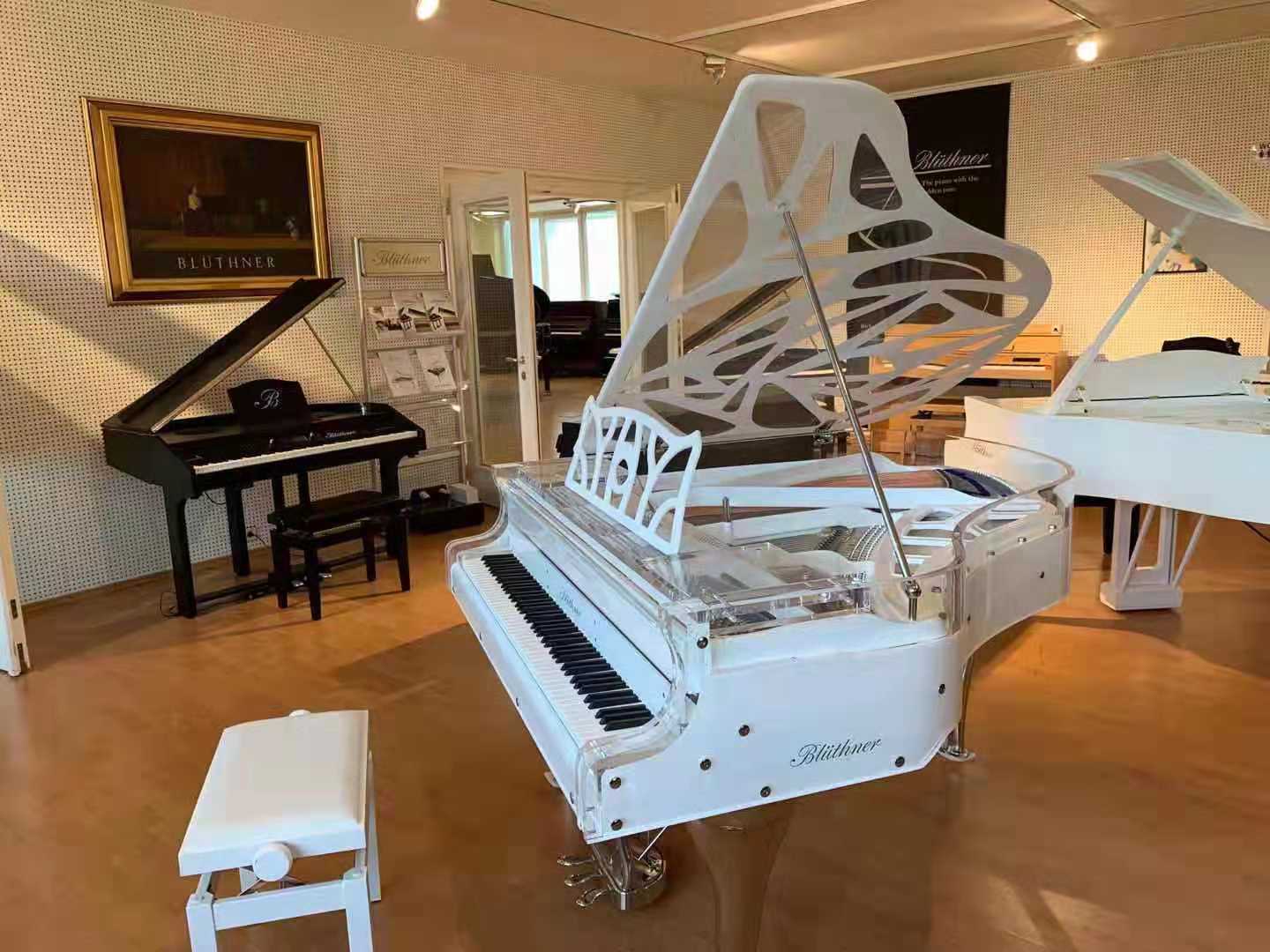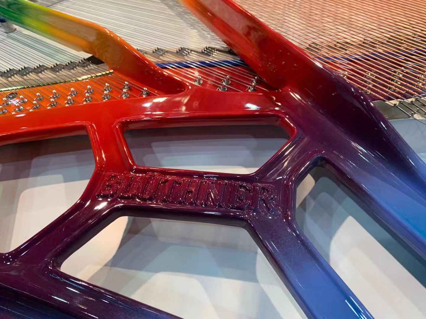 在現(xiàn)場眾多令人目不暇接的常規(guī)型號與定制型號中,最為奪人眼球的莫過于現(xiàn)場的一架博蘭斯勒水晶詩意定制系列——“彩虹之上”。區(qū)別于市面上其他的水晶鋼琴,Blüthner重新定義了如何打造一架真正完全透明的三角鋼琴。摒棄了所有厚重的木支架與不計其數(shù)的略顯古板的螺栓,以全透明材質(zhì)打造。除了鋼琴的音板之外,從鋼琴的頂蓋、外框、音板邊框到所有的鍵盤檔、琴譜架、琴鍵蓋、琴腿均有透明材質(zhì)精心打磨而成。透過晶瑩通透的琴身,如同陽光照射通過了晶瑩靈動的水滴,光線被折射在天空上形成七彩的光譜——展現(xiàn)在面前的是宛如盛滿了七彩顏料水彩畫板的鐵支架。