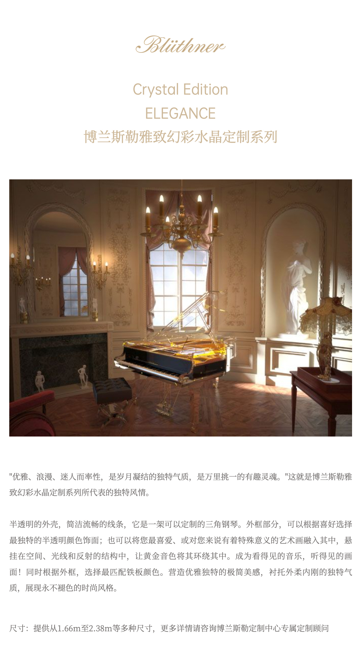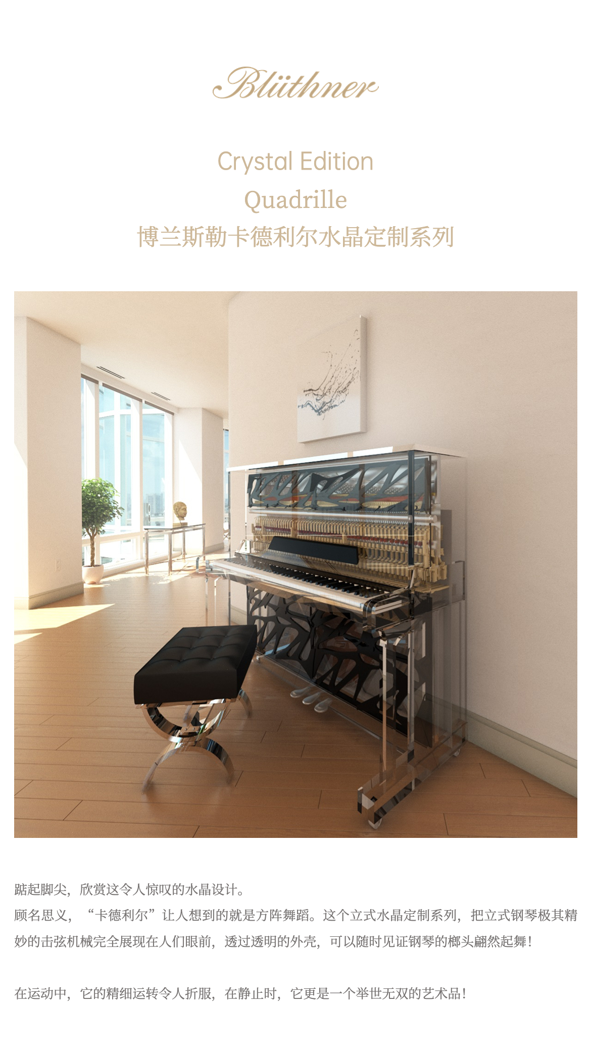 每臺鋼琴均接受定制,可根據(jù)您的品味或需求指定特殊飾面與個性化裝飾。從典雅的鑲木板材與手工雕刻鑲嵌工藝,到最具創(chuàng)新性的現(xiàn)代藝術造型,博蘭斯勒皆可助您實現(xiàn)美學構(gòu)想。