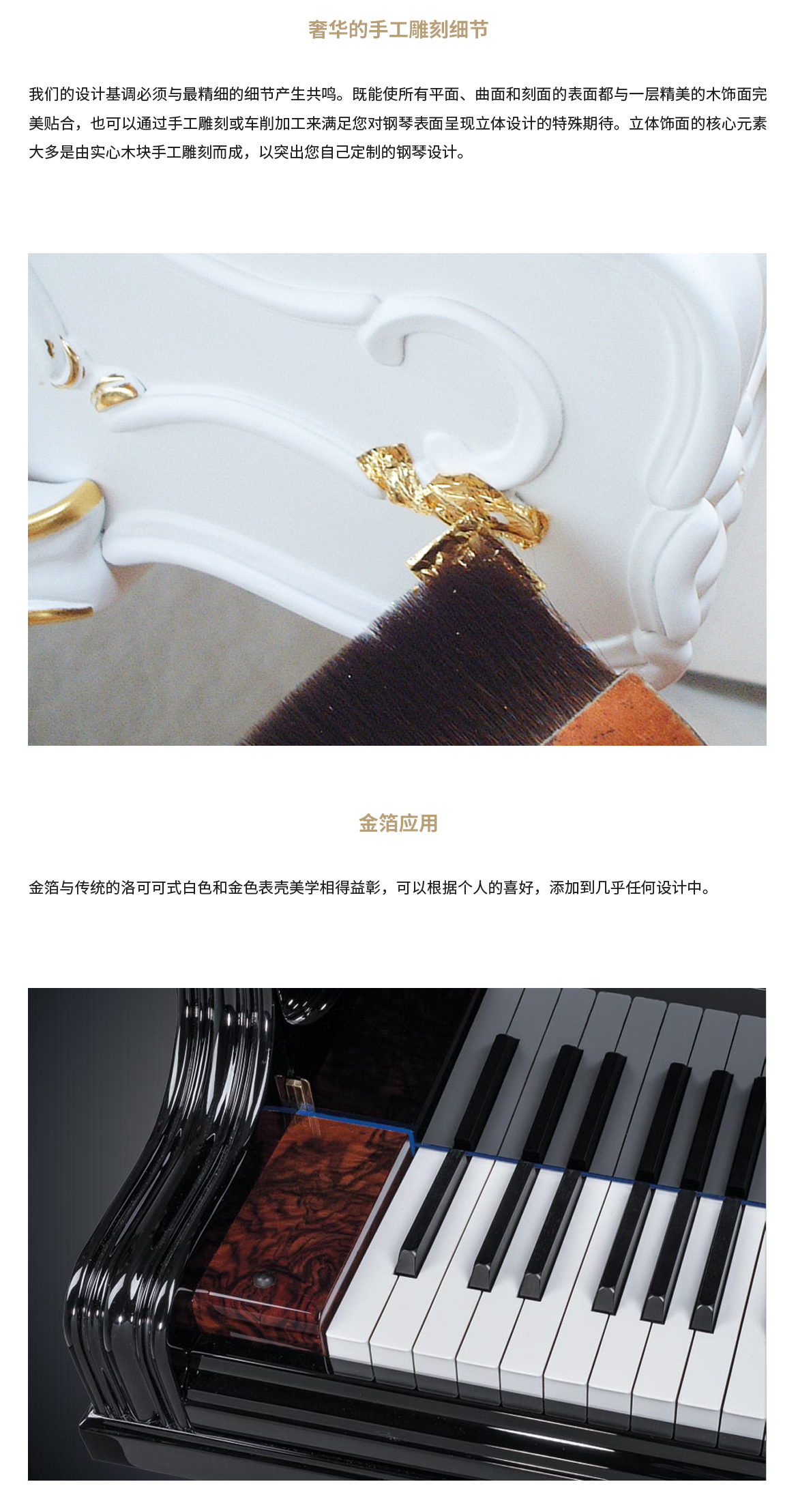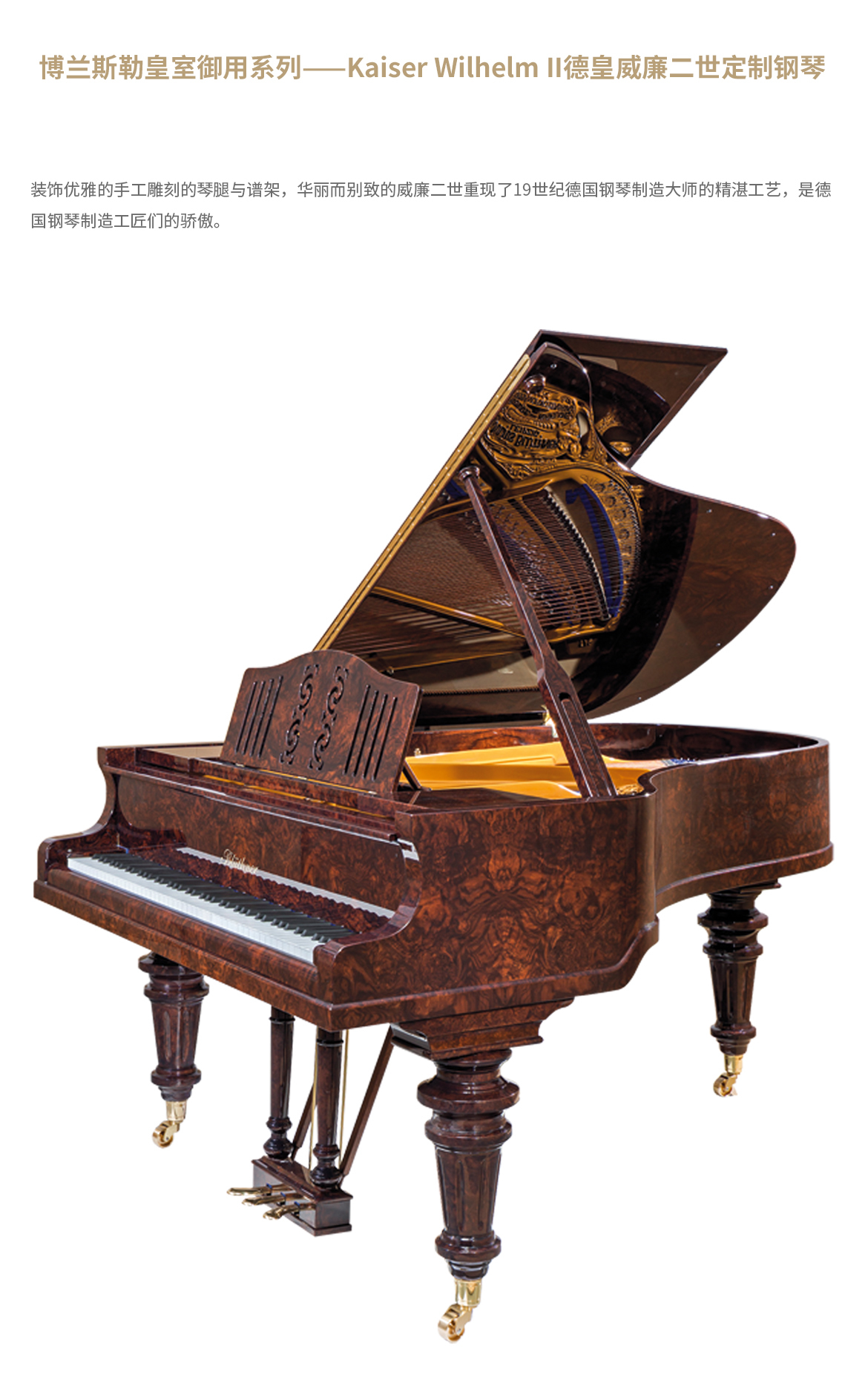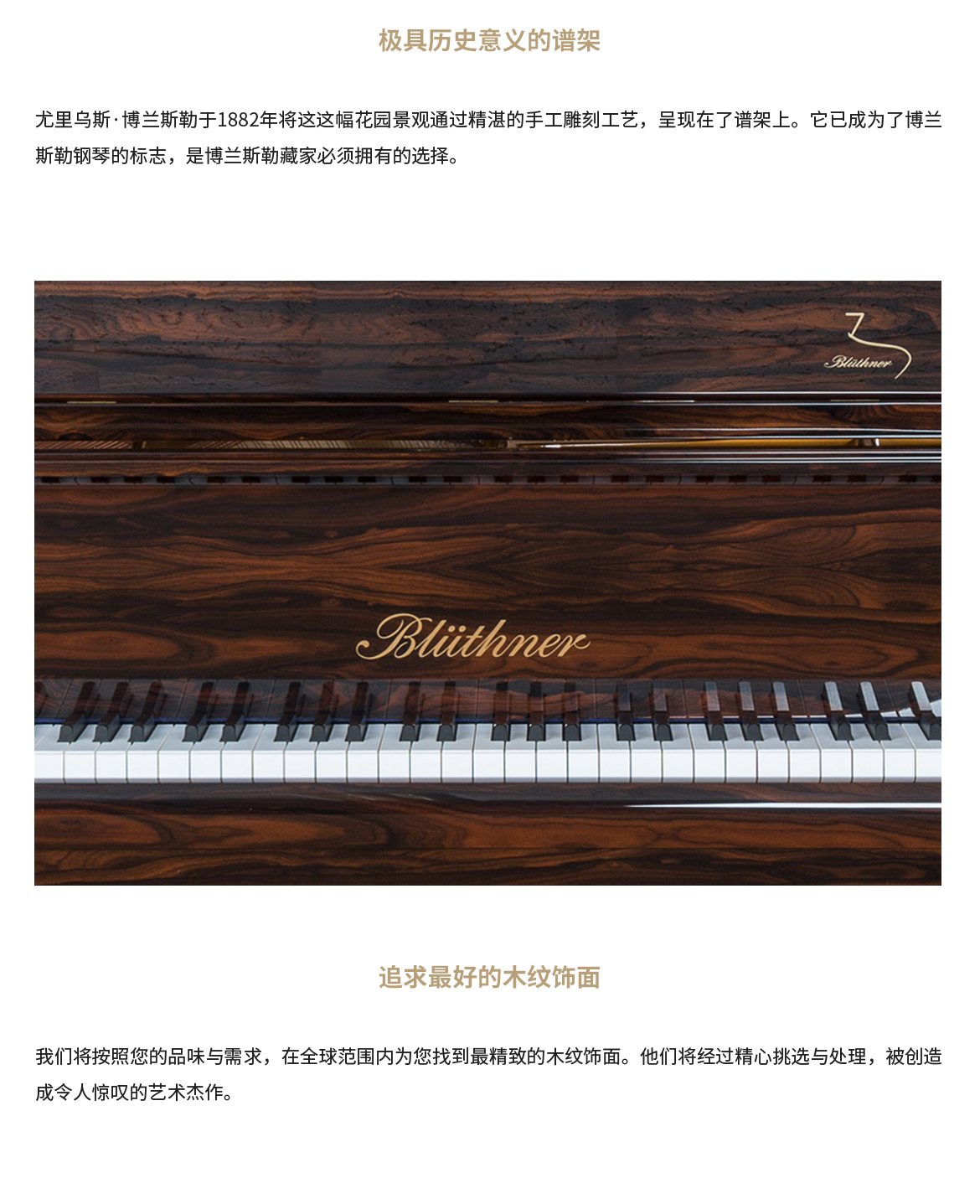 每臺鋼琴均接受定制,可根據(jù)您的品味或需求指定特殊飾面與個性化裝飾。從典雅的鑲木板材與手工雕刻鑲嵌工藝,到最具創(chuàng)新性的現(xiàn)代藝術(shù)造型,博蘭斯勒皆可助您實(shí)現(xiàn)美學(xué)構(gòu)想。