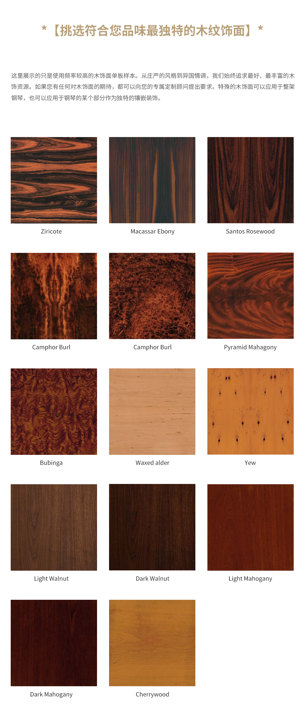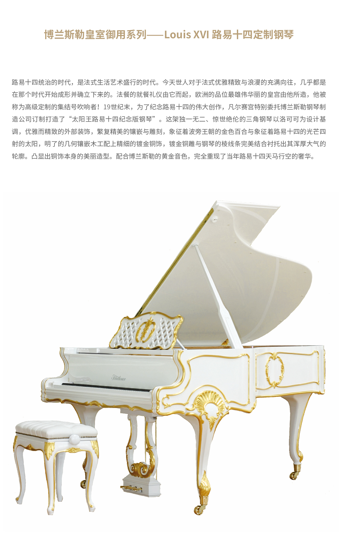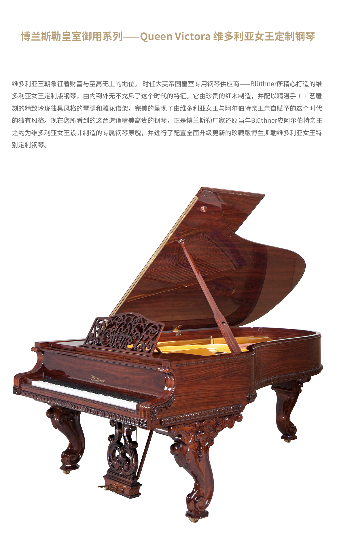 每臺鋼琴均接受定制,可根據(jù)您的品味或需求指定特殊飾面與個性化裝飾。從典雅的鑲木板材與手工雕刻鑲嵌工藝,到最具創(chuàng)新性的現(xiàn)代藝術(shù)造型,博蘭斯勒皆可助您實(shí)現(xiàn)美學(xué)構(gòu)想。