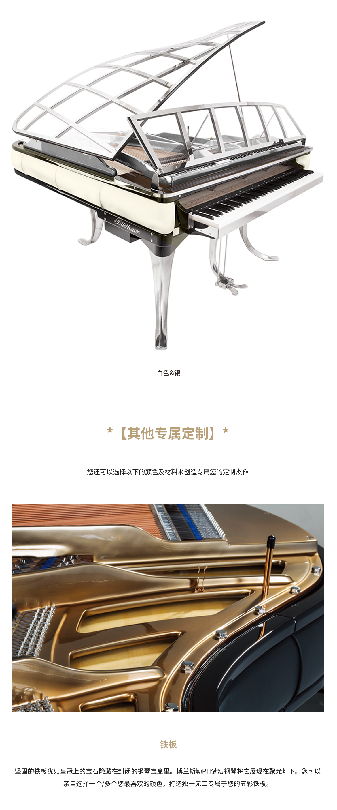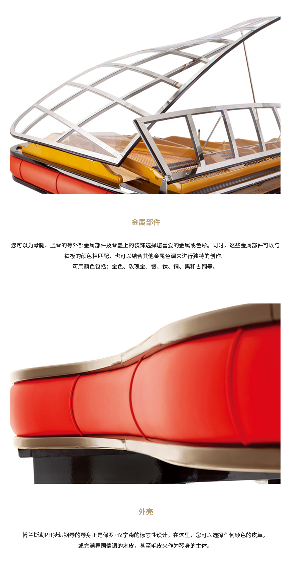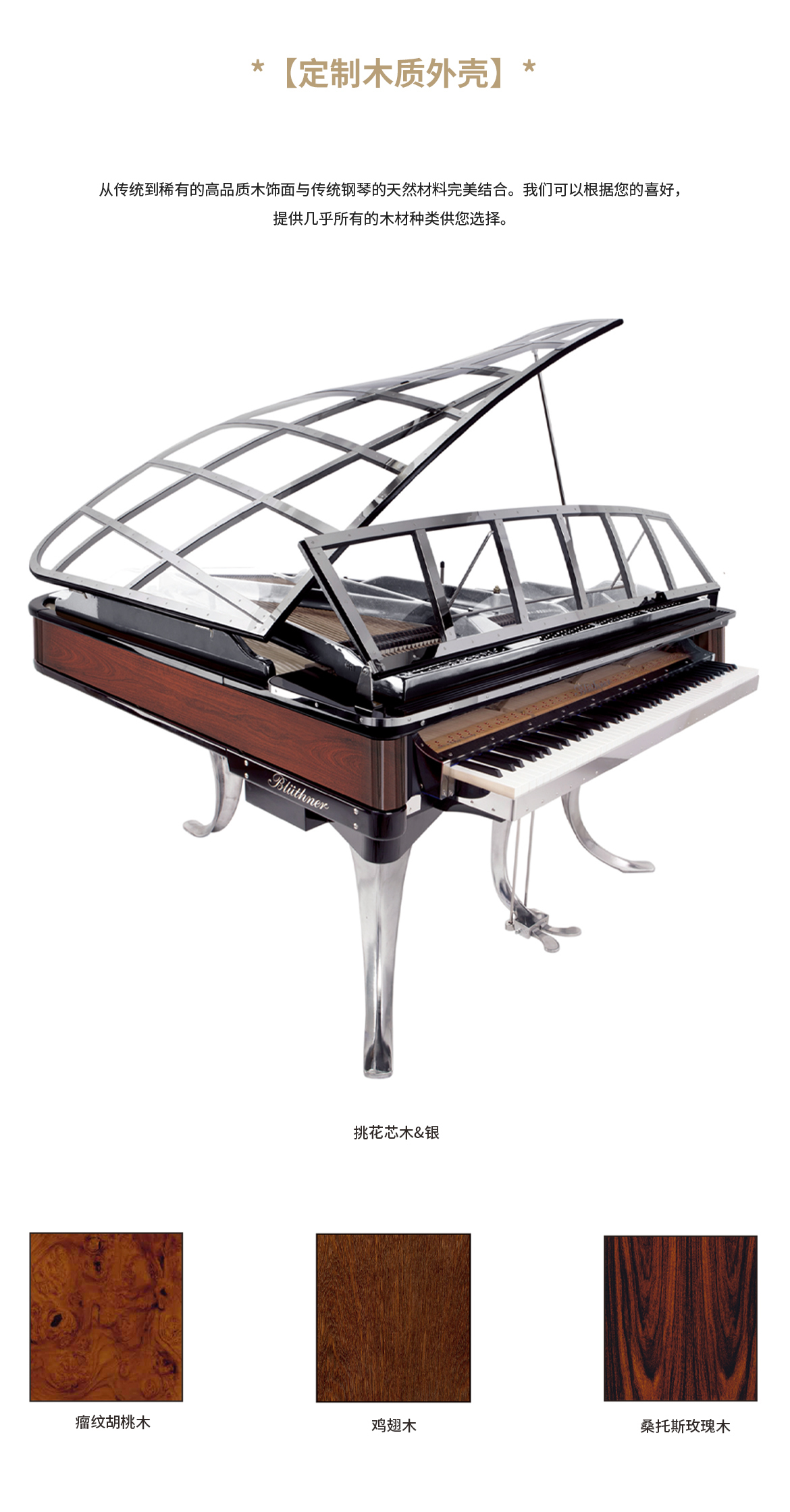 每臺(tái)鋼琴均接受定制,可根據(jù)您的品味或需求指定特殊飾面與個(gè)性化裝飾。從典雅的鑲木板材與手工雕刻鑲嵌工藝,到最具創(chuàng)新性的現(xiàn)代藝術(shù)造型,博蘭斯勒皆可助您實(shí)現(xiàn)美學(xué)構(gòu)想。