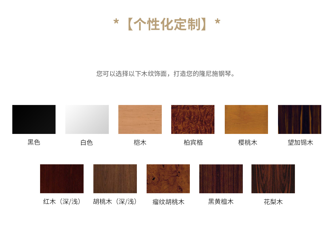 每臺(tái)鋼琴均接受定制,可根據(jù)您的品味或需求指定特殊飾面與個(gè)性化裝飾。從典雅的鑲木板材與手工雕刻鑲嵌工藝,到最具創(chuàng)新性的現(xiàn)代藝術(shù)造型,博蘭斯勒皆可助您實(shí)現(xiàn)美學(xué)構(gòu)想。